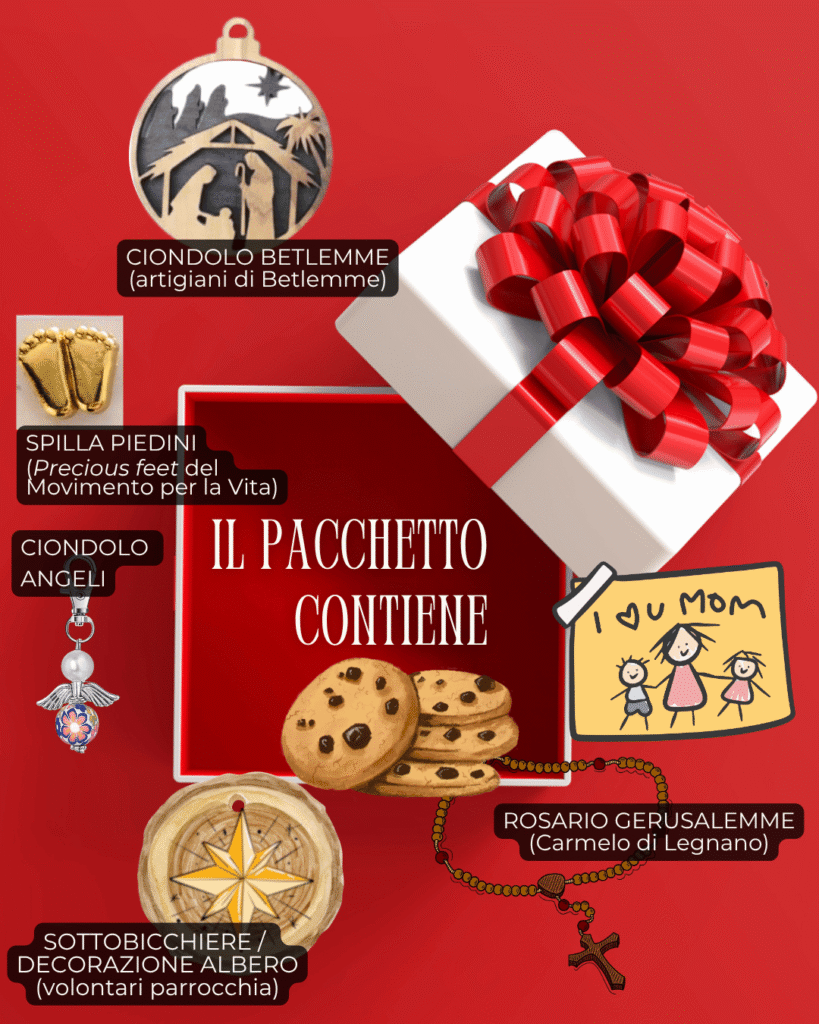- Ogni box contiene piccoli segni natalizi — un rosario e un ciondolo di Betlemme, un piedino di bimbo e ali d’angelo — simboli di speranza e amore per la vita.